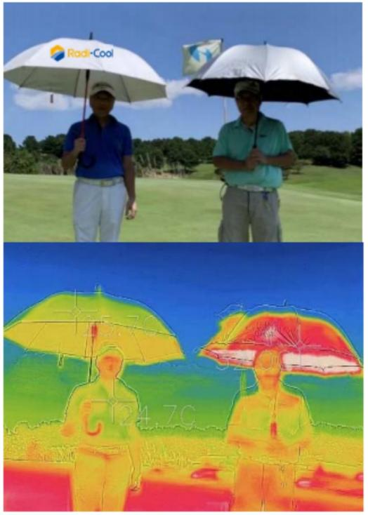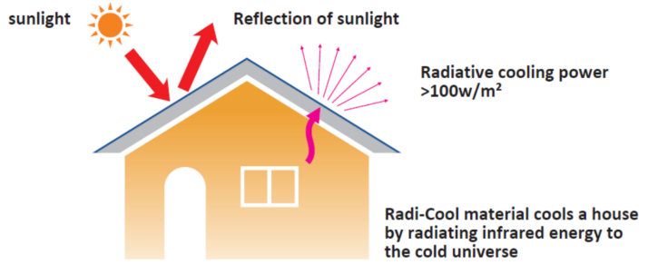 The Radi-Cool radiative cooling meta material features a high solar reflectivity and a high infrared emissivity across the atmospheric window. When applied onto an object on the Earth, it establishes an effective radiative heat transfer channel between the object and the cold Universe. Without consuming electricity, the meta material cools objects even under direct sunshine.