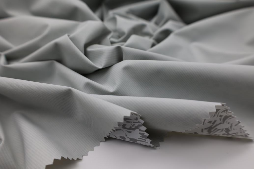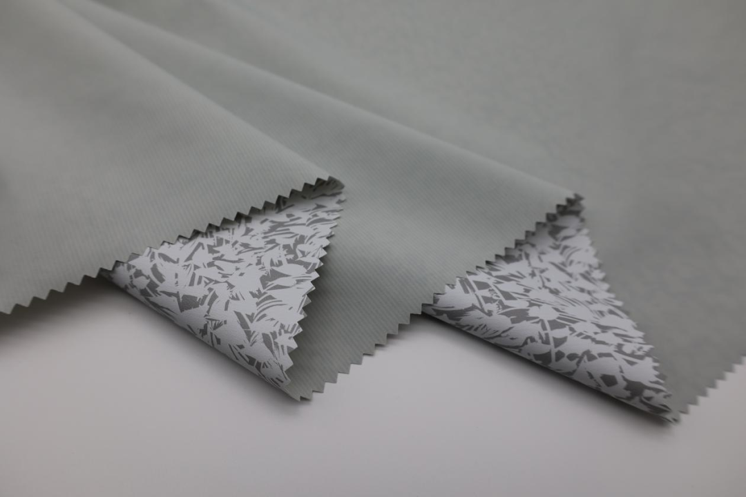 后經(jīng)過環(huán)保工藝將印花膜與之覆合到一起,在兼具基布特點同時又增加了高耐水壓、高透濕、防絨等優(yōu)良性能,更是將內(nèi)里花膜的花紋在布的正面隱隱反襯出來,更增加了一種朦朧的科技感與神秘感,讓人不自覺沉迷其中;
