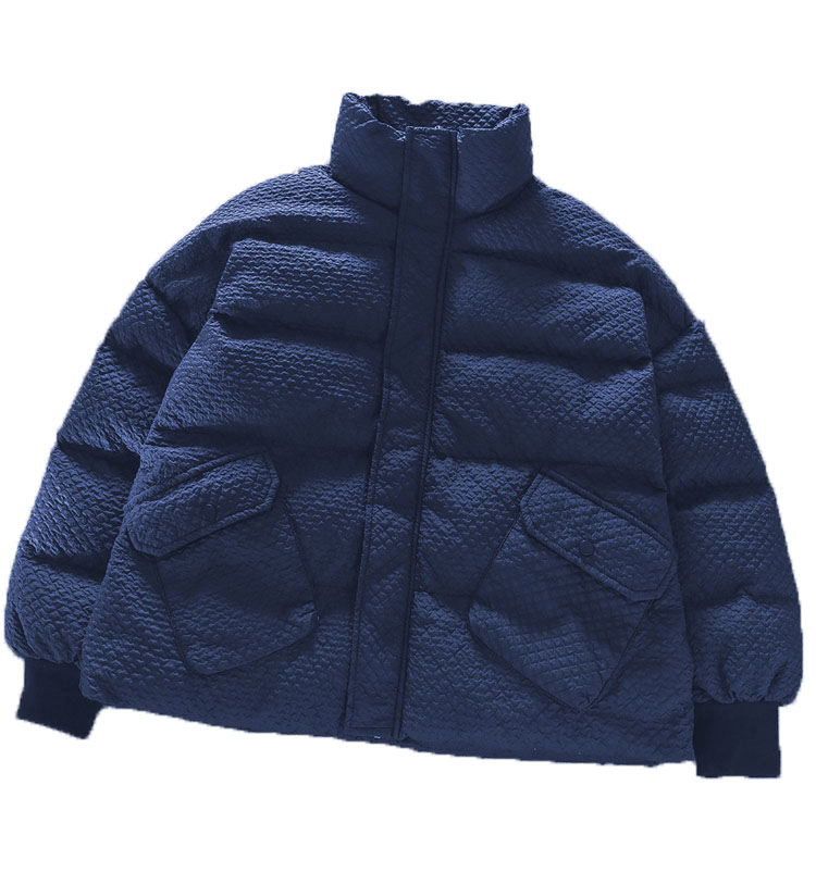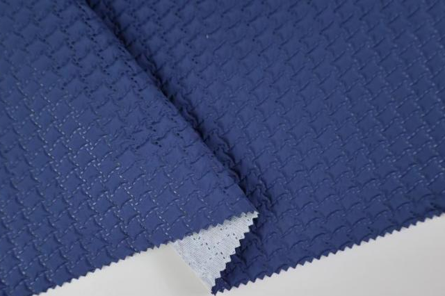 產品原料上應用的是多孔聚酯纖維加彈絲,面料的密度是性價比較高的310T;手感柔軟細膩,具有絨感;后續做壓皺工藝,菱形幾何花型與輕薄填充物之間相呼應,凹凸不平的壓皺風格突出面料的立體氛圍,豐富人們的視覺體驗,為單調的防寒面料上增添幾分趣味與文藝。