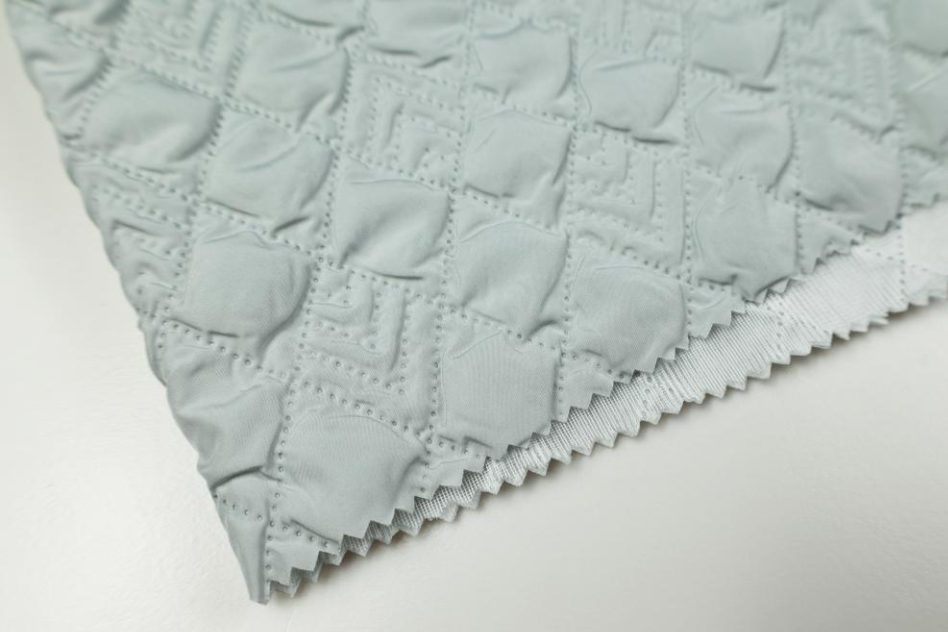 產品原料是應用定制生產的27D多孔聚酯纖維,面料的密度高達450T;面料絲絨的絨感,手感柔軟,不易變形;外觀是無針無線無膠特點,整體提升了面料的防棉性和保暖性;豐富多樣的花紋圖案,打造出3D肌理,契合時尚趨勢。