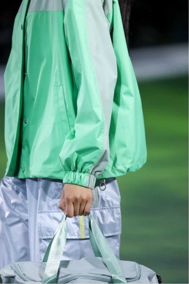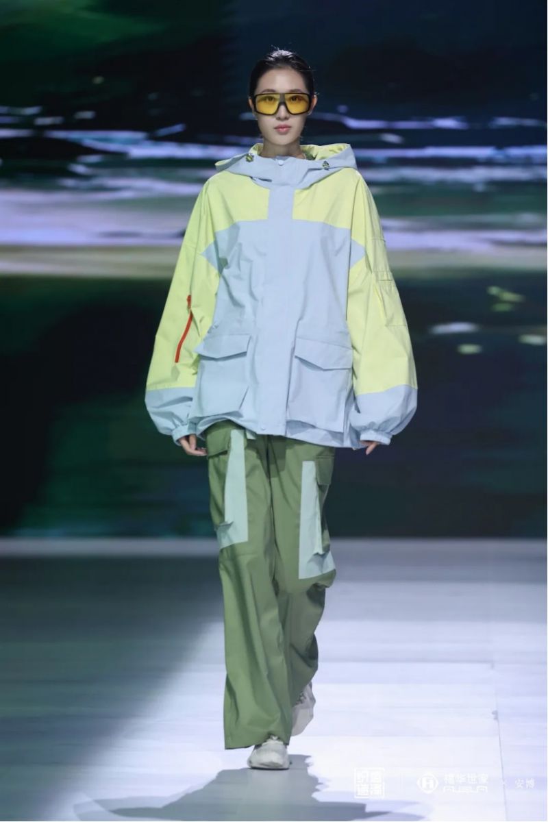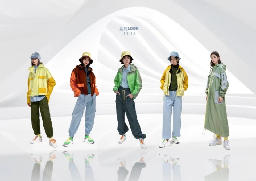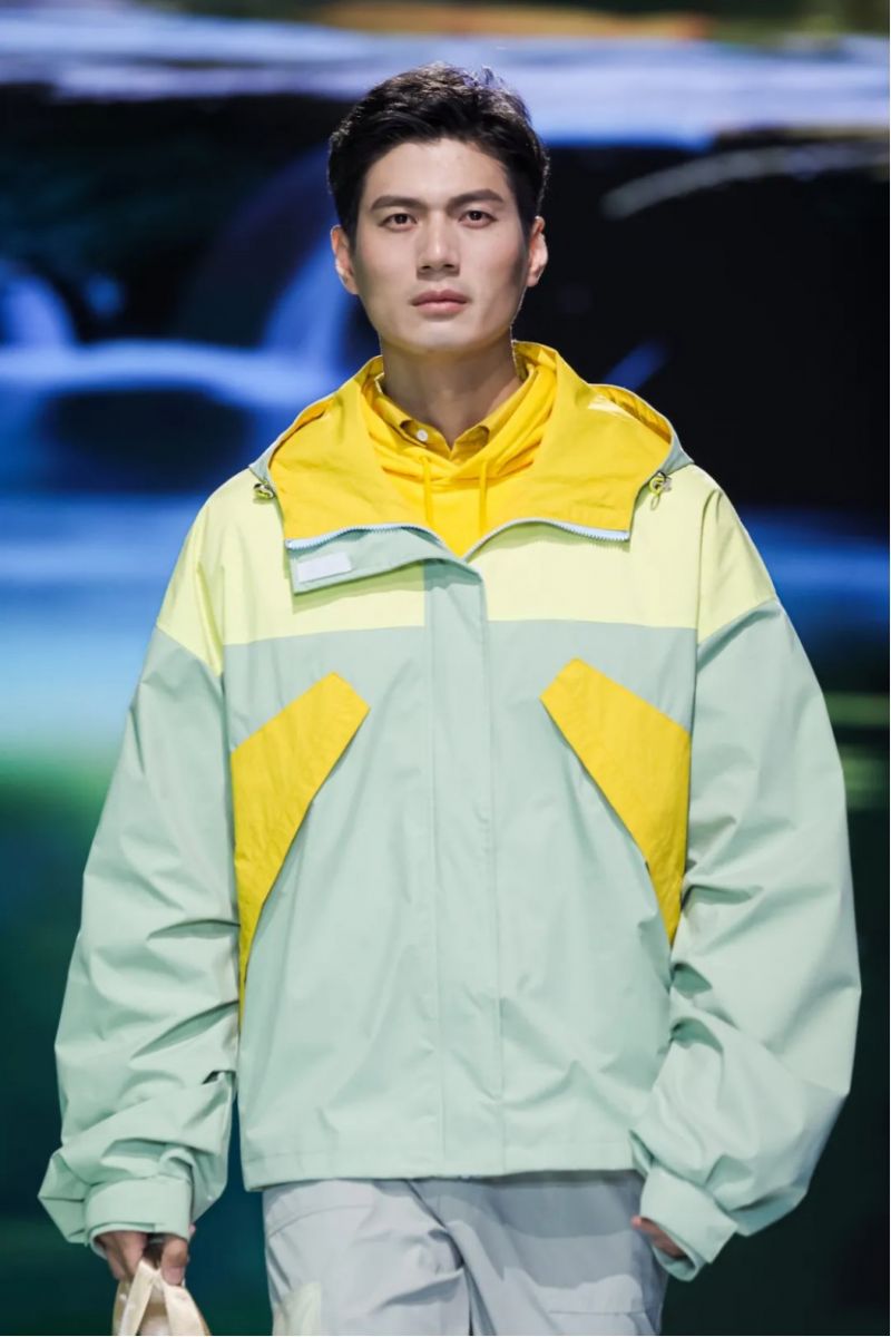 本系列設計色彩取之于自然萬物中的天、地、水、植,例如嫩芽黃、萊姆綠、香水藍等等。同時在面料上的選擇也考慮到了不同溫度環境下的穿著體驗,包括不同克重的錦綸、滌綸面料,同時考慮到了環保因素,一部分漁網回收的錦綸同樣運用到了此系列中。通過色彩與面料的巧妙搭配,讓本系列整體風格顯得明快自然、舒適閑逸,通勤與戶外的有機結合,也讓此類輕戶外風格更能得到當下消費者的青睞。